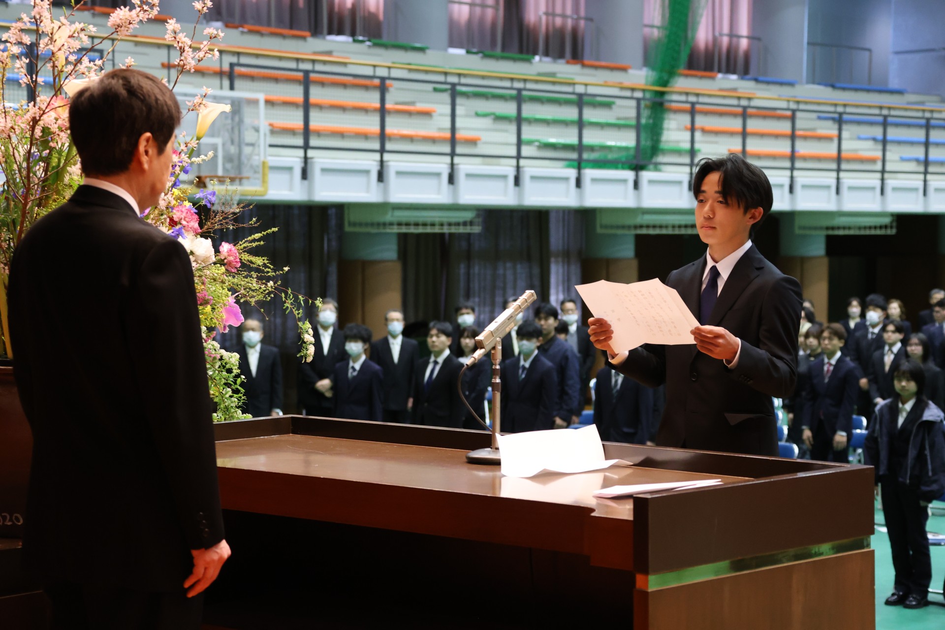 また、置かれた環境や立場で取り組む課題、壁に対して傍観者では無くプレーヤーとして関わって欲しい、と述べられました。「観客席で壁を叩く人を眺めるよりは、自分自身がグラウンドやステージに立って藻掻いた方がずっと面白いし、楽しい。若い皆さんは傷ついても容易に回復できます。失敗を恐れず、自分の可能性を追求して下さい。百回の見物より一回の実践を」と、新入生の新たな門出にエールを送りました。