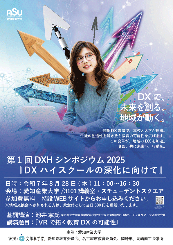 このたび愛知産業大学では、地域におけるデジタルトランスフォーメーション(DX)の推進に寄与すべく、シンポジウム「DXハイスクールの深化に向けて 〜事例報告と高大連携の推進〜」を開催いたします。本シンポジウムは、文部科学省が推進する「DXハイスクール」構想のもと、各高等学校における実践事例を共有するとともに、今後の高大連携のあり方を共に考える機会として企画されたものです。