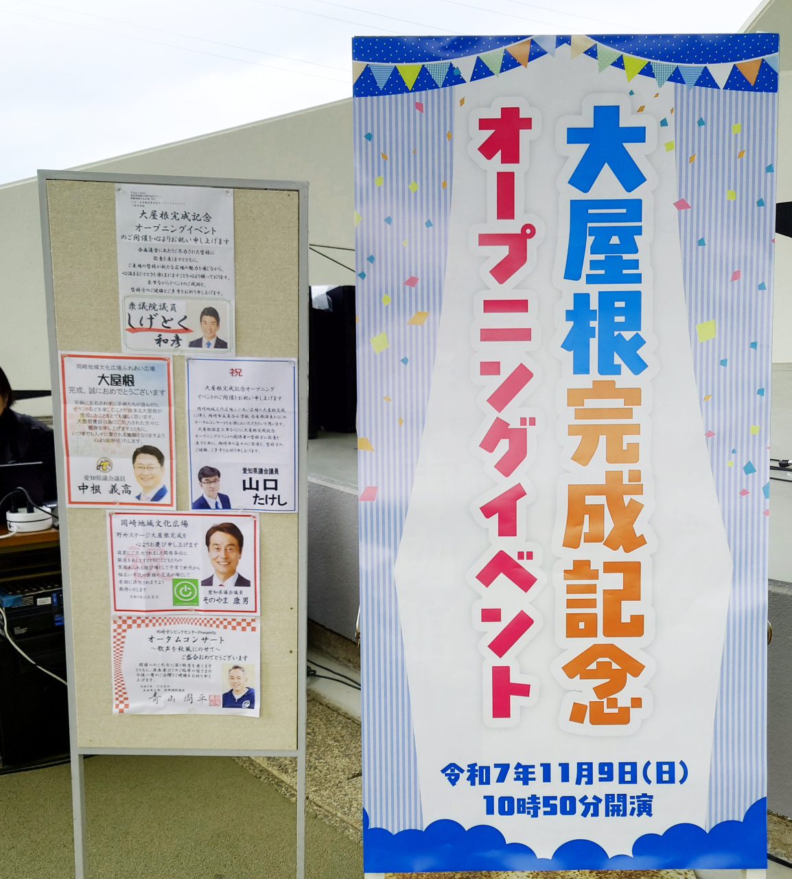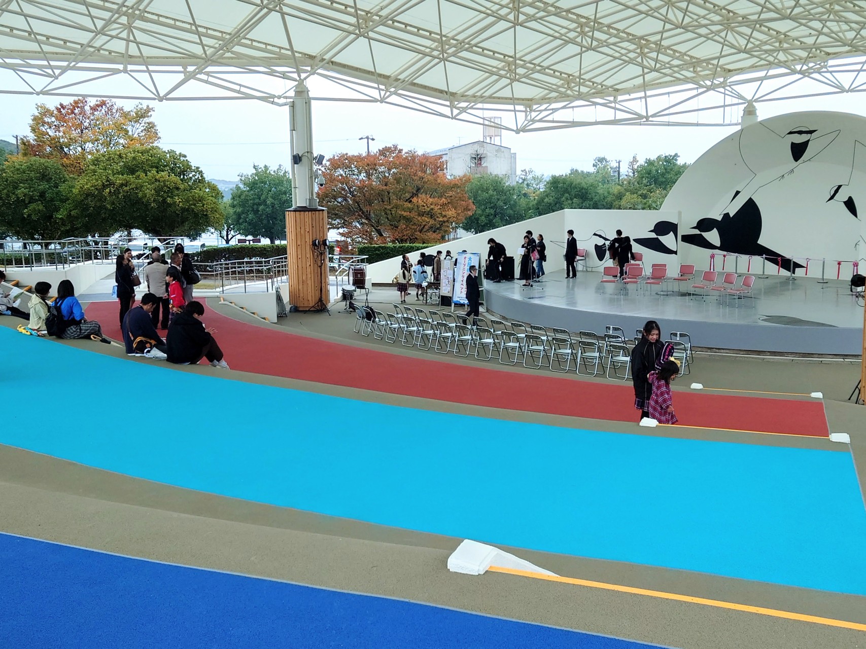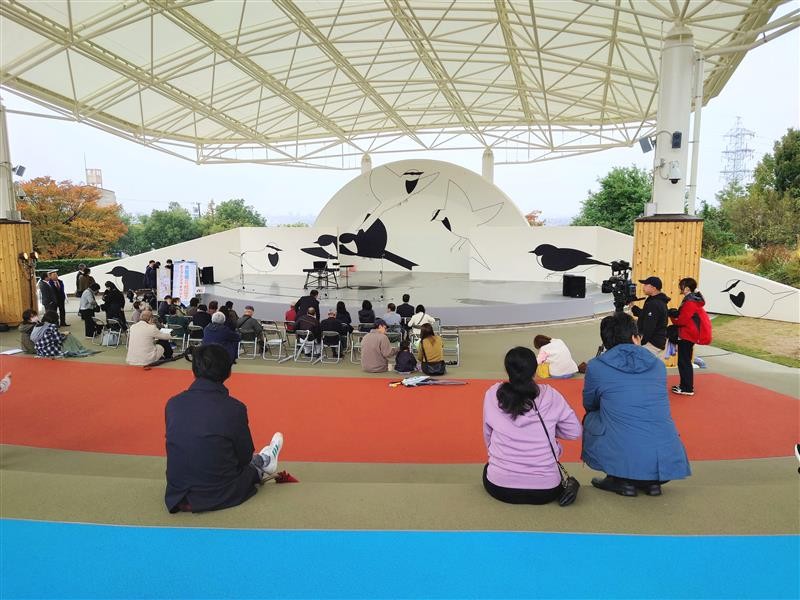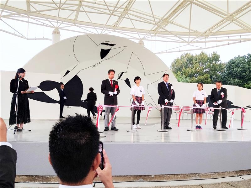 このたび大屋根と野外ステージが完成し、2025年11月9日(日)にオープニングイベントが開催されました。壁画デザインは大学院造形学研究科デザイン学専攻のSUN QIHENGさん(2025年3月修了)、塗替え作業はデザイン学科卒業生の林亨さんが担当。当日の司会はスマートデザイン学科3年生の渡邊乃愛さんが務めました。