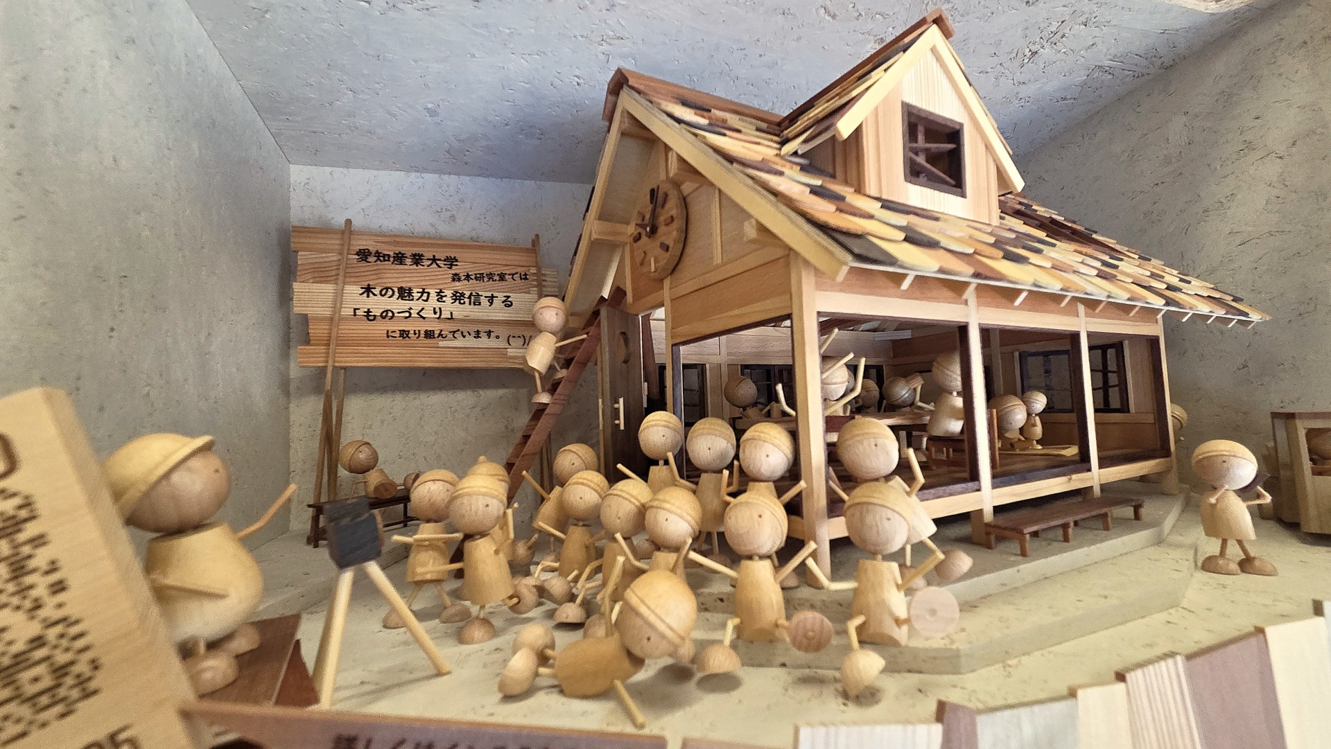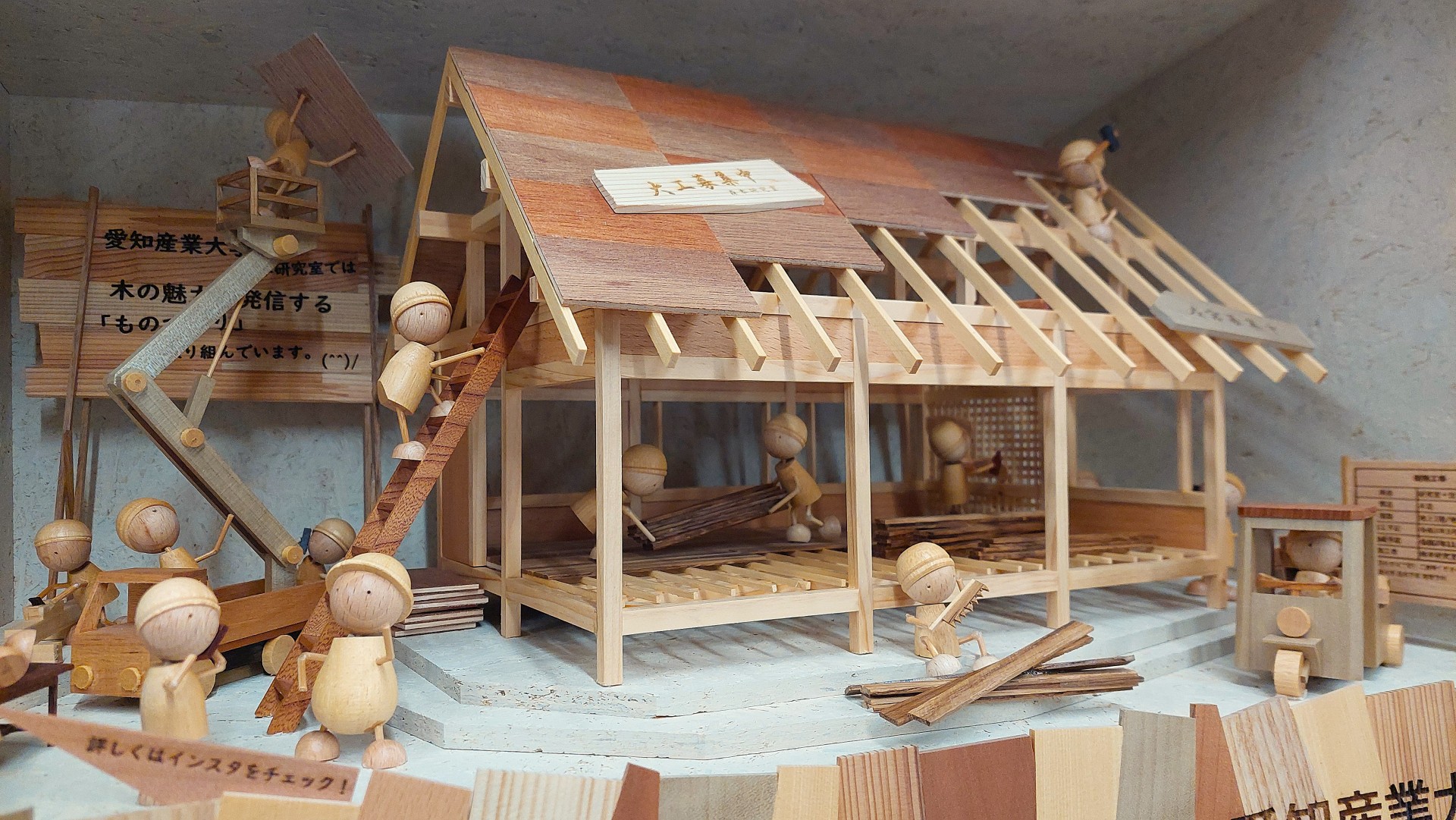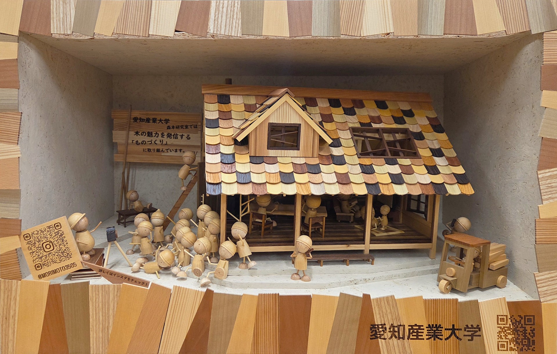 【教員情報】道の駅藤川宿の「きらり岡崎コーナー」にて展示中の建築学科森本研究室の活動を紹介する作品『木びとの建築』が完成いたしました