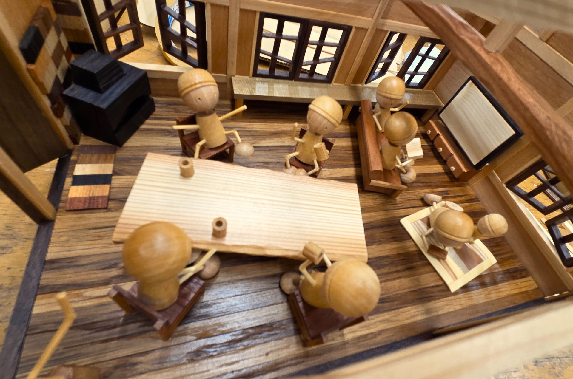 本学で木工に取り組む学生に見立てた「木びと」たちが木造の小屋を建てていく様子を1年間かけて展示しています。